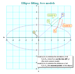 For linear-algebraic analysis of data, "fitting" usually means trying to find the curve that minimizes the vertical (y-axis) displacement of a point from the curve (e.g., ordinary least squares). However, for graphical and image applications, geometric fitting seeks to provide the best visual fit; which usually means trying to minimize the orthogonal distance to the curve (e.g., total least squares), or to otherwise include both axes of displacement of a point from the curve. Geometric fits are not popular because they usually require non-linear and/or iterative calculations, although they have the advantage of a more aesthetic and geometrically accurate result.[18][19][20]