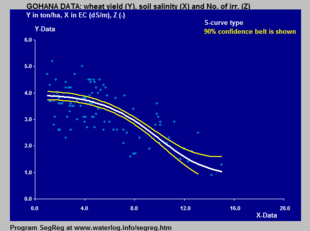 In agriculture the inverted logistic sigmoid function (S-curve) is used to describe the relation between crop yield and growth factors. The blue figure was made by a sigmoid regression of data measured in farm lands. It can be seen that initially, i.e. at low soil salinity, the crop yield reduces slowly at increasing soil salinity, while thereafter the decrease progresses faster.