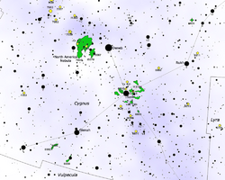 Map of the constellation Cygnus marking the location of bright and more challenging deep-sky objects