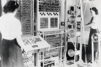The bombe was an electromechanical device whose function was to discover some of the daily settings of the Enigma machines on the various German military networks.[18][38][39] Its pioneering design was developed by Alan Turing (with an important contribution from Gordon Welchman) and the machine was engineered by Harold 'Doc' Keen of the British Tabulating Machine Company. Each machine was about 7 feet (2.1 m) high and wide, 2 feet (0.61 m) deep and weighed about a ton.[40]