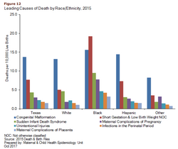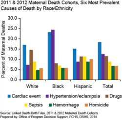 In the United States the maternal mortality ratio rose during the years 2002-2015.[3] Although improvements in health care facilitated a dramatic decline in maternal mortality worldwide during the 20th century, women still die from complications of pregnancy, though there are significant differences in the top causes per region and income class.[3] Since 1990 the World Health Organization measures both the maternal mortality ratio and the maternal mortality rate. In 1994 the period of measurement for a "maternal-related death" after childbirth was extended from six weeks to a year after the "birth event". The United States is one of the few developed countries for which both of the WHO measurements have gone up and not down. Nationally as well as in Texas, black women have a maternal mortality rate more than twice as high as White women and this disparity gap has increased since 2007, but the causes of this increase were unclear in 2013 and therefore the task force was formed to investigate.[1] The estimated maternal mortality rate (per 100,000 live births) for 48 states and Washington, DC (excluding California and Texas) increased by 26.6%, from 18.8 in 2000 to 23.8 in 2014.[4] California showed a declining trend, whereas Texas had a sudden increase in 2011-2012.[4] The Texas rate had nearly doubled.[5] Although reproductive health and maternal death is significantly different for black women, this is not part of the study conducted by the Boston Black Women's Health Study and the taskforce is the only known body studying this aspect. Since convening in 2013 the task force has produced two reports, in July 2014 and in September 2016.