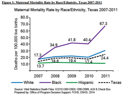 The Maternal Mortality and Morbidity Task Force was started by the Department of State in 2013 to help reduce maternal death in Texas . The task force and DSHS must submit a joint report on the findings of the task force and recommendations to the governor, lieutenant governor, speaker of the House of Representatives, and appropriate committees of the Texas Legislature by September 1 of each even-numbered year, beginning September 1, 2016.[1] The maternal mortality ratio (MMR) for the state of Texas was concluded to be the highest in the developed world in 2016, with the maternal mortality rate (MMRate) of the state surging beyond the poor MMRate of 48 states of the US (excluding California and Texas) at 23.8% to a remarkably high 35.8%.[2]