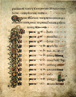 Augustine[18] notes that the count of generations in the Book of Luke is 77, a number symbolizing the forgiveness of all sins.[19] This count also agrees with the seventy generations from Enoch[20] set forth in the Book of Enoch, which Luke probably knew.[21] Though Luke never counts the generations as Matthew does, it appears he also followed hebdomadic principle of working in sevens. However, Irenaeus counts only 72 generations from Adam.[22]