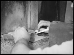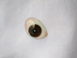 The earliest known evidence of the use of ocular prosthesis is that of a woman found in Shahr-I Sokhta, Iran[1] dating back to 2900–2800 BC.[2] It has a hemispherical form and a diameter of just over 2.5 cm (1 inch). It consists of very light material, probably bitumen paste. The surface of the artificial eye is covered with a thin layer of gold, engraved with a central circle (representing the iris) and gold lines patterned like sun rays. On both sides of the eye are drilled tiny holes, through which a golden thread could hold the eyeball in place. Since microscopic research has shown that the eye socket showed clear imprints of the golden thread, the eyeball must have been worn during her lifetime. In addition to this, an early Hebrew text references a woman who wore an artificial eye made of gold.[3] Roman and Egyptian priests are known to have produced artificial eyes as early as the fifth century BC constructed from painted clay attached to cloth and worn outside the socket.[4]