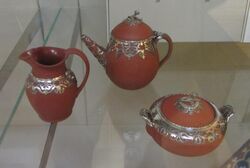 The Sèvres porcelain factory, after its establishment in 1738, concentrated on producing teapots, but the focus had switched to tea sets after the manufacturing was moved to the new building in 1756.[3] Mass production of European tea sets started in 1790s,[4] but they were still expensive and remained a privilege of the wealthy; the less well-to-do families occasionally cobbled together whatever tea pieces they had in order to hold a collective tea party.[5] The sets became more affordable by the second half of the 19th century.[4] The poor families might still use teaware "of the period when the handles were unknown", but the desire to own a full tea set became universal.[4]