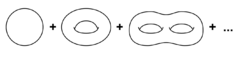 The discrete sum is a sum over possible topologies, which for euclidean bosonic orientable closed strings are compact orientable Riemannian surfaces and are thus identified by a genus [math]\displaystyle{ h }[/math]. A normalization factor [math]\displaystyle{ \mathcal{N} }[/math] is introduced to compensate overcounting from symmetries. While the computation of the partition function corresponds to the cosmological constant, the N-point function, including [math]\displaystyle{ p }[/math] vertex operators, describes the scattering amplitude of strings.