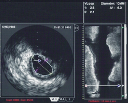 Intravascular ultrasound, also known as a percutaneous echocardiogram is an imaging methodology using specially designed, long, thin, complex manufactured catheters attached to computerized ultrasound equipment to visualize the lumen and the interior wall of blood vessels.