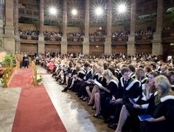 Named Tounis College (Town's College), the university opened its doors to students on 14 October 1583, with an attendance of 80–90.[1] At the time, the college mainly covered liberal arts and divinity.[24][25] Instruction began under the charge of a graduate from the University of St Andrews, theologian Robert Rollock, who first served as Regent, and from 1586 as principal of the college.[26] Initially Rollock was the sole instructor for first-year students, and he was expected to tutor the 1583 intake for all four years of their degree in every subject. The first cohort finished their studies in 1587, and 47 students graduated (or 'laureated') with an M.A. degree.[26] When King James VI visited Scotland in 1617, he held a disputation with the college's professors, after which he decreed that it should henceforth be called the "Colledge [sic] of King James".[27][28] The university was known as both Tounis College and King James' College until it gradually assumed the name of the University of Edinburgh during the 17th century.[24][29]