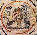 The early Christian paintings were the wall frescoes of the Catacombs of Rome. The earliest works tend to employ Christian symbols (e.g. bread, wine, or the fish symbolizing Jesus)... The Early Christian period also includes the earliest known European illuminated manuscripts. [1] The imagery of the catacombs consisted of cryptic, if not hermetic, symbols of the salvation of the soul: orans figures, parable incidents, Old Testament parallels such as Noah in the Ark. [2]