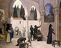 In Modern Times main Christian painters were, among a long list, El Greco, Nicolas Poussin, Francisco de Zurbarán, Anthony van Dyck, Bartolomé Esteban Murillo, Cristóbal de Villalpando, Miguel Cabrera and Salvador Dalí. One who succeeds in arousing emotion is Eugene Delacroix, whose "Christ on Mt. Olivet" (1827), "Descent from the Cross" (1834), "Good Samaritan" at Mantua, "Christ Stilling the Tempest" (1849), and especially his Chapel of the Angels in the church of St. Sulpice (19th century), are examples of immortal passion and poetry. Ibidem Delacroix painted fourteen versions of the story "Christ Asleep during the Tempest while crossing the Lake of Gennesaret".