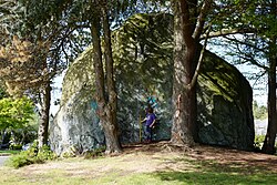 Wedgwood Rock is a glacial erratic (known to geologists as the Wedgwood Erratic) near the neighborhood of Wedgwood in Seattle, Washington. Its mineral composition matches that of Mount Erie, on Fidalgo Island in Skagit County, Washington,[1] 55 mi (89 km) north. Prior to the establishment of the Wedgwood neighborhood, the erratic was known first as Lone Rock and later simply as Big Rock.[2] Transported to its site by the Puget Lobe of the Cordilleran Ice Sheet during the Vashon Glaciation more than 14,000 years ago, it was a landmark for Native Americans in what was once a dense forest. Today, the rock sits in a residential neighborhood on 28th Avenue NE, near NE 72nd Street, still surrounded by trees and brush, and kept clear by local residents.