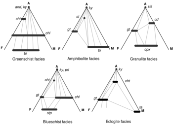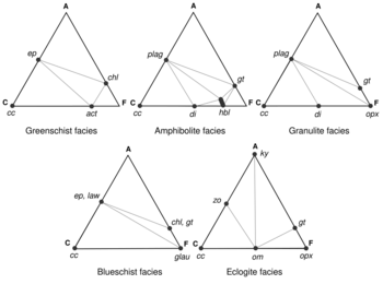 A metamorphic facies is a set of mineral assemblages in metamorphic rocks formed under similar pressures and temperatures.[1] The assemblage is typical of what is formed in conditions corresponding to an area on the two dimensional graph of temperature vs. pressure (See diagram in Figure 1).[1] Rocks which contain certain minerals can therefore be linked to certain tectonic settings, times and places in the geological history of the area.[1] The boundaries between facies (and corresponding areas on the temperature v. pressure graph) are wide because they are gradational and approximate.[1] The area on the graph corresponding to rock formation at the lowest values of temperature and pressure is the range of formation of sedimentary rocks, as opposed to metamorphic rocks, in a process called diagenesis.[1]