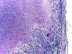 Tuberculosis is classified as one of the granulomatous inflammatory diseases. Macrophages, epithelioid cells, T lymphocytes, B lymphocytes, and fibroblasts aggregate to form granulomas, with lymphocytes surrounding the infected macrophages. When other macrophages attack the infected macrophage, they fuse together to form a giant multinucleated cell in the alveolar lumen. The granuloma may prevent dissemination of the mycobacteria and provide a local environment for interaction of cells of the immune system.[63] However, more recent evidence suggests that the bacteria use the granulomas to avoid destruction by the host's immune system. Macrophages and dendritic cells in the granulomas are unable to present antigen to lymphocytes; thus the immune response is suppressed.[64] Bacteria inside the granuloma can become dormant, resulting in latent infection. Another feature of the granulomas is the development of abnormal cell death (necrosis) in the center of tubercles. To the naked eye, this has the texture of soft, white cheese and is termed caseous necrosis.[63]