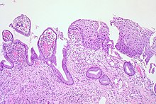 It most commonly occurs at the squamocolumnar junction of the cervix, a transitional area between the squamous epithelium of the vagina and the columnar epithelium of the endocervix.[12] It can also occur in vaginal walls and vulvar epithelium.