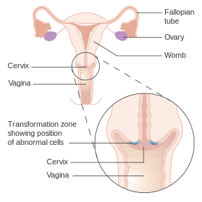 Cervical intraepithelial neoplasia (CIN), also known as cervical dysplasia, is the abnormal growth of cells on the surface of the cervix.[2] While not cancer, there is a risk, that over time, it could turn into cervical cancer.[2][1] It does not result in symptoms.[1]