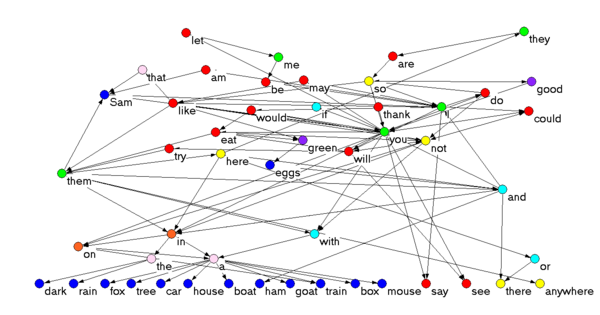 The relation between trophic level and node function can be seen in networks other than food webs. The figure shows a word adjacency network derived from the book Green Eggs and Ham, by Dr. Seuss.[3] The height of nodes represents their trophic levels (according here to the edge direction which is the opposite of that suggested by the arrows, which indicate the order in which words are concatenated in sentences). The syntactic function of words is also shown with node colour. There is a clear relationship between syntactic function and trophic level: the mean trophic level of common nouns (blue) is [math]\displaystyle{ s_{noun} = 1.4 \pm 1.2 }[/math], whereas that of verbs (red) is [math]\displaystyle{ s_{verb} = 7.0 \pm 2.7 }[/math]. This example illustrates how trophic coherence or incoherence might emerge from node function, and also that the trophic structure of networks provides a means of identifying node function in certain systems.
