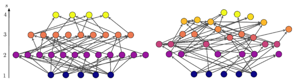 The figure shows two networks which differ in their trophic coherence. The position of the nodes on the vertical axis corresponds to their trophic level. In the network on the left, nodes fall into distinct (integer) trophic levels, so the network is maximally coherent [math]\displaystyle{ (q=0) }[/math]. In the one on the right, many of the nodes have fractional trophic levels, and the network is more incoherent [math]\displaystyle{ (q=0.49) }[/math].[6]