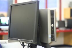 A desktop computer (often abbreviated desktop[1]) is a personal computer designed for regular use at a stationary location on or near a desk (as opposed to a portable computer) due to its size and power requirements. The most common configuration has a case that houses the power supply, motherboard (a printed circuit board with a microprocessor as the central processing unit, memory, bus, certain peripherals and other electronic components), disk storage (usually one or more hard disk drives, solid state drives, optical disc drives, and in early models a floppy disk drive); a keyboard and mouse for input; and a monitor, speakers, and, often, a printer for output. The case may be oriented horizontally or vertically and placed either underneath, beside, or on top of a desk.