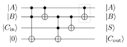 Using only the Toffoli and CNOT quantum logic gates, it is possible to produce quantum full- and half-adders.[12][13][14] The same circuits can also be implemented in classical reversible computation, as both CNOT and Toffoli are also classical logic gates.