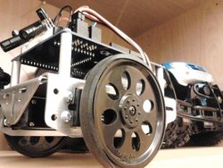 The green detachable main circuit, mounted on the top of the robot is called the Board of Education. The microcontroller which plugs into a socket on the green circuit board is called the BASIC Stamp . The BASIC Stamp is programmed in PBASIC. The rear wheel is a drilled polyethylene ball held in place with a cotter pin. Wheels are machined to fit on the servo spline and held in place with a screw. The BASIC Stamp is easy to program.[1] The Boe–Bot is small, approximately four inches wide, and runs on four AA batteries. There is no soldering required for construction.[2]