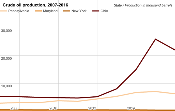 Crude oil production in Pennsylvania and neighboring states (2007-2016)