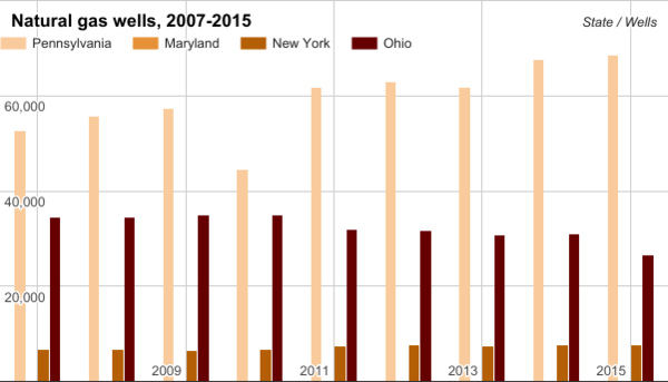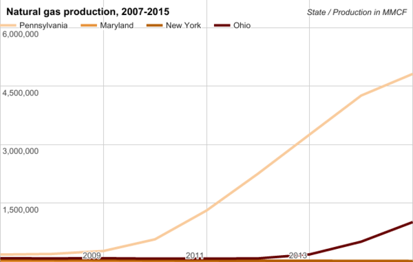 Natural gas production in Pennsylvania and neighboring states (2007-2015)