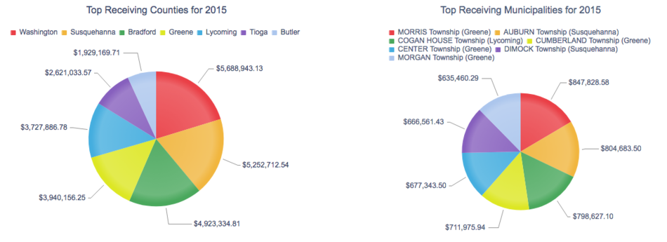 Top counties and municipalities receiving revenue from impact fees levied on fracking, 2015 (Source: Pennsylvania Public Utilities Commission)