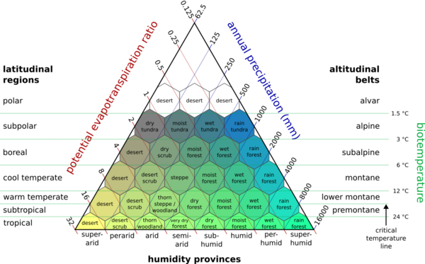 Holdridge life zone classification scheme. Although conceived as three-dimensional by its originator, it is usually shown as a two-dimensional array of hexagons in a triangular frame.