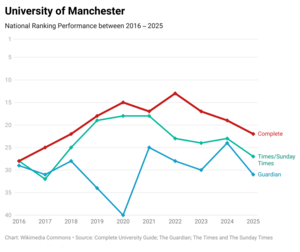 However, while world rankings (such as QS, ARWU, THE) typically place the university within the top 10 in the UK, the university ranks slightly less favourably in national studies. 'The Complete University Guide 2022' ranked Manchester 13th out of universities in the UK, and ‘The Times/Sunday Times Good University Guide 2021' placed it at 18th.[89] A 2016 poll voted Manchester as the third "most underrated university in the UK".[93]