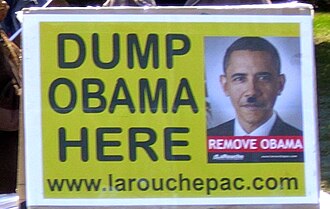 But of course the ruling cabal won, and the reins of power from London were merely transferred from Bush to Obama.[note 3] Therefore, in LaRouche's eyes, Obama is Hitler.[42] This explains why LaRouche supporters have taken part in the Tea Party protests against the Obama administration, holding signs proclaiming Obama to be the new Hitler… even though LaRouche and his supporters have run their political campaigns under the Democratic Party? (The Democrats, however, soundly reject LaRouche and kick his followers out on a regular basis.)[43][44]