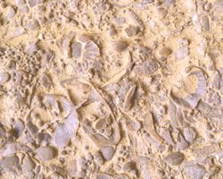 Hand sample of a sedimentary rock. This sample comes from the Carnian (Upper Triassic) of the Dolomites, and is better described as a oolitic/bioclastic grainstone, a kind of carbonate rock. The small spheres in the rock are oolites, all other elements are fossils. Among others, brachiopods, molluscs and echinoderm fragments are recognizable in this picture. It is typical of many carbonate rocks to be composed mainly by fossil shells.