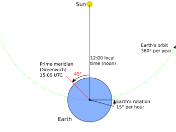 Presently, lay-person calculations of longitude can be made by noting the exact local time (leaving out any reference for daylight saving time) when the Sun is at its highest point in the sky. The calculation of noon can be made more easily and accurately with a small, exactly vertical rod driven into level ground—take the time reading when the shadow is pointing due north (in the northern hemisphere). Then take your local time reading and subtract it from GMT (Greenwich Mean Time) or the time in London, England. For example, a noon reading (12:00) near central Canada or the US would occur at approximately 6 pm (18:00) in London. The 6-hour difference is one quarter of a 24-hour day, or 90 degrees of a 360-degree circle (the Earth). The calculation can also be made by taking the number of hours (use decimals for fractions of an hour) multiplied by 15, the number of degrees in one hour. Either way, it can be demonstrated that much of central North America is at or near 90 degrees west longitude. Eastern longitudes can be determined by adding the local time to GMT, with similar calculations.