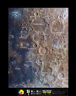 The crater area(top right) in a Selenochromatic format Image (Si)