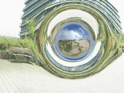 For a simplified notion of a wormhole, space can be visualized as a two-dimensional surface. In this case, a wormhole would appear as a hole in that surface, lead into a 3D tube (the inside surface of a cylinder), then re-emerge at another location on the 2D surface with a hole similar to the entrance. An actual wormhole would be analogous to this, but with the spatial dimensions raised by one. For example, instead of circular holes on a 2D plane, the entry and exit points could be visualized as spherical holes in 3D space leading into a four-dimensional "tube" similar to a spherinder.[citation needed]
