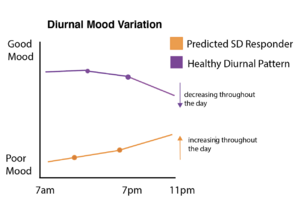 Mood fluctuations are currently thought to be dependent on circadian processes. A typical healthy individual without a mood disorder shows circadian-locked fluctuations in mood, with positive mood beginning right after the morning awakening, and decaying as the day goes on during prolonged wakefulness. A typical individual with depression will show the opposite mood fluctuation cycle, with a low mood right after morning awakening, which gradually becomes more positive with prolonged wakefulness. These circadian-locked changes across the day are referred to as "diurnal" variations in mood. Evidence across many sleep deprivation studies suggests that an individual's diurnal mood fluctuations can be used to predict whether they will respond to sleep deprivation therapy.[30] Individuals with depression who show the typical low morning mood that increases throughout the day are more likely to respond positively to sleep deprivation than individuals who show mood fluctuations that deviate from the typical pattern.[30] One caveat to these findings is that a single individual may show diurnal fluctuations that vary day-to-day, showing typical diurnal changes on one day while not showing any changes (constant mood) on the next. This complexity was addressed in studies that followed single individuals and administered repeated sleep deprivation on days when the individual showed different mood fluctuations. The studies showed that an individual's ability to show the typical mood fluctuations was a better predictor of whether they would respond to sleep deprivation treatment than the individual's mood state on the particular day that they underwent sleep deprivation.[30]