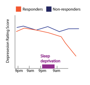 The response rate to sleep deprivation is generally agreed to be approximately 50%. A 2017 meta-analysis of 66 sleep studies with partial or total sleep deprivation in the treatment of depression found that the overall response rate (immediate relief of symptoms) to total sleep deprivation was 50.4% of individuals, and the response rate to partial sleep deprivation was 53.1%[4] In 2009, a separate review on sleep deprivation found that 1700 patients with depression across 75 separate studies showed a response rate that ranged from 40 - 60%.[5] For reference, the non-response rate for conventional antidepressant pharmacotherapy is estimated to be ~30%, but symptom relief may be delayed by several weeks after the onset of treatment (compared to the immediate, transient relief induced by sleep deprivation) .[6] Metrics of mood change vary highly across studies, including surveys of daily mood, or clinician administered interviews that assess the severity of depression symptoms. One benefit to sleep deprivation is that it can provide relief from symptoms within 6 –12 hours after sleep deprivation, a rapid effect compared to the 4–6 weeks that it may take conventional treatments to have an effect.[7] One downside of sleep deprivation therapy is that the beneficial effects are transient, and disappear after even short periods of sleep.[8][7] Even ultra-short periods of sleep lasting seconds, termed microsleeps, have been shown to cause a relapse in symptoms.[9]