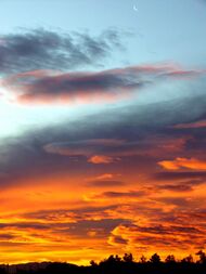 Along with pressure tendency, the condition of the sky is one of the more important parameters used to forecast weather in mountainous areas. Thickening of cloud cover or the invasion of a higher cloud deck is indicative of rain in the near future. At night, high thin cirrostratus clouds can lead to halos around the Moon, which indicate the approach of a warm front and its associated rain.[20] Morning fog portends fair conditions and can be associated with a marine layer, an indication of a stable atmosphere.[21] Rainy conditions are preceded by wind or clouds which prevent fog formation. The approach of a line of thunderstorms could indicate the approach of a cold front. Cloud-free skies are indicative of fair weather for the near future.[22] The use of sky cover in weather prediction has led to various weather lore over the centuries.[23]