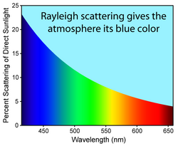 Except for direct sunlight, most of the light in the daytime sky is caused by scattering, which is dominated by a small-particle limit called Rayleigh scattering. The scattering due to molecule-sized particles (as in air) is greater in the directions both toward and away from the source of light than it is in directions perpendicular to the incident path.[7] Scattering is significant for light at all visible wavelengths, but is stronger at the shorter (bluer) end of the visible spectrum, meaning that the scattered light is bluer than its source: the Sun. The remaining direct sunlight, having lost some of its shorter-wavelength components, appears slightly less blue.[5]