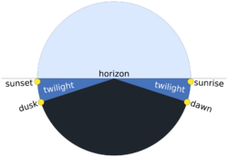 Twilight is divided into three stages according to the Sun's depth below the horizon, measured in segments of 6°. After sunset, the civil twilight sets in; it ends when the Sun drops more than 6° below the horizon. This is followed by the nautical twilight, when the Sun is between 6° and 12° below the horizon (depth between −6° and −12°), after which comes the astronomical twilight, defined as the period between −12° and −18°. When the Sun drops more than 18° below the horizon, the sky generally attains its minimum brightness.[19]
