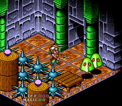 The isometric perspective results in artifacts in terms of distances between sprites. Some critics viewed this as optical illusions intended to test the player, but others criticized it as a technical flaw.[lower-alpha 5] Detractors wrote the issue was especially noticeable with the collision detection of enemies, joking that the foes were surrounded by a big invisible forcefield of death.[3][11][20][32] Frank of Super Action reported the unclear perspective caused jumps to be incredibly hard, especially those that require Glendaal to be on the edge of a platform; in these situations, the player would need "almost supernatural depth perception", where the sprite would appear to float next to a platform when actually on the edge.[4] Game Power suggested the unclear perspective was a result of a lack of shadows.[9] Even from reviewers who found the unclear perspective intentional, responses were mixed. The Elf of Superjuegos found it an "ingenious" design choice, and Super Control journalist Paul dismissed it as a "cop-out" for designing puzzles legitimately.[5][8] A critic from German magazine Video Games said it led to unfair platform puzzles because one mistake could cause instant death.[10] Game Zone's Andy Butcher wrote that the isometric view meant it takes time to adjust to the controls, as the D-Pad is in relation to the perspective.[11]