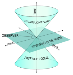 In a further development in his 1908 "Space and Time" lecture,[6] Minkowski gave an alternative formulation of this idea that used a real-time coordinate instead of an imaginary one, representing the four variables (x, y, z, t) of space and time in the coordinate form in a four-dimensional real vector space. Points in this space correspond to events in spacetime. In this space, there is a defined light-cone associated with each point, and events not on the light cone are classified by their relation to the apex as spacelike or timelike. It is principally this view of spacetime that is current nowadays, although the older view involving imaginary time has also influenced special relativity.