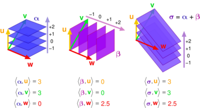 One quantum mechanical analogy explored in the literature is that of a de Broglie wave (scaled by a factor of Planck's reduced constant) associated with a momentum four-vector to illustrate how one could imagine a covariant version of a contravariant vector. The inner product of two contravariant vectors could equally well be thought of as the action of the covariant version of one of them on the contravariant version of the other. The inner product is then how many times the arrow pierces the planes.[18] The mathematical reference, (Lee 2003), offers the same geometrical view of these objects (but mentions no piercing).