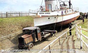The tugboat Radium Express being portaged around the rapids at Fort Smith, on the Slave River in the Northwest Territories.