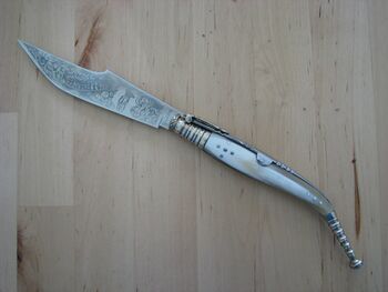 The navaja used a variety of blade and handle styles over the years, with certain regions of Spain favoring distinct patterns. The classical Andalusian blade style is today popularly known as the navaja bandolera. The navaja bandolera is a variation of what is termed a "clip point" blade, a design featuring a concave unsharpened false edge near the blade tip. Compared to its slim, almost feminine handle, the exaggerated belly and recurved blade of the classical navaja is particularly large and menacing. Many blade patterns bear a striking resemblance to that of the Bowie knife, and some historians believe the navaja's blade served as inspiration for the latter.[19] The classic Andalusian navaja of the craftsman era utilized forged carbon steel blades predominantly sourced from Spanish communities with a long history of swordmaking and cutlery manufacture, such as Albacete, Santa Cruz de Mudela, and Toledo.[20] The traditional navaja was typically fitted with a handle made of wood, horn, bone, or pierced copper or brass[17] that was reinforced with a steel or brass liner, although examples can also be found with expensive materials such inlaid silver, ivory, and even gold. From the mid-19th century, many 'Spanish' navajas were actually imported from France; most of these imported French patterns lack a locking device for the blade. Many examples of this period were fitted with metal bolsters and butt caps for additional strength and protection; these are often carved, filed, or engraved with decorations.
