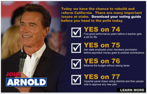 Proposition 75 was one of four ballot measures on the 2005 ballot that Arnold Schwarzenegger included in his plan for the state. The other three were Proposition 74, Proposition 76 and Proposition 77. All four were defeated.