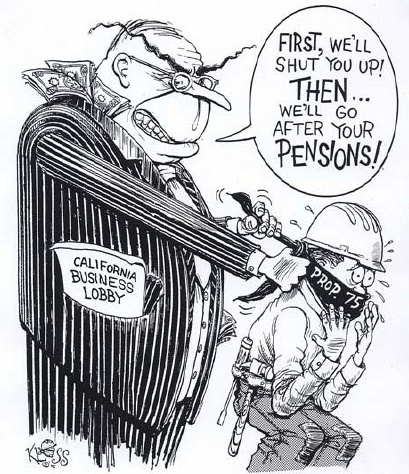 Prop. 75 is unnecessary and unfair. Its hidden agenda is to weaken public employees and strengthen the political influence of big corporations. Prop. 75 does not protect the rights of teachers, nurses, police, and firefighters. Instead it’s designed to reduce their ability to respond when politicians would harm education, health care, and public safety. In 1998, voters rejected a similar proposition and union members voted NO overwhelmingly. TARGETS TEACHERS, NURSES, FIREFIGHTERS, AND POLICE Why does 75 target people who take care of all of us? Recently, teachers fought to restore funding the state borrowed from our public schools, but never repaid. Nurses battled against reductions in hospital staffing to protect patients. Police and firefighters fought against elimination of survivor’s benefits for families of those who die in the line of duty. Prop. 75 is an unfair attempt to diminish the voice of teachers, nurses, firefighters, and police at a time when we need to hear them most. Prop. 75 only restricts public employees. It does not restrict corporations—even though corporations spend shareholders’ money on politics. The nonpartisan Center for Responsive Politics says corporations already outspend unions in politics nationally by 24 to 1. Prop. 75 will make this imbalance even worse. CURRENT LAW ALREADY PROTECTS WORKERS No public employee in California can be forced to become a member of a union. Non-members pay fees to the union for collective bargaining services, but the U.S. Supreme Court has consistently ruled that unions cannot use these fees for political purposes. The union must send financial statements to the worker to ensure that no unauthorized fees are used for politics. Today, 25% of state employees contribute no money to their union’s political activities. Union members already have the right to democratically vote their leaders into and out of office and to establish their own internal rules concerning political contributions. Prop. 75 takes away union members’ right to make their own decisions and substitutes a government-imposed bureaucratic process. VIOLATES EMPLOYEES’ PRIVACY Prop. 75 requires members who want to participate to sign a government-imposed personal disclosure form that could be circulated in the workplace. This form, with information about individual employees and their political contributions, could be accessed by a state agency—an invasion of individual privacy which could raise the possibility of intimidation and retaliation against employees on the job. WHO’S BEHIND PROP. 75? Its lead sponsor is Lewis Uhler, a former John Birch Society activist, who campaigned for Bush’s Social Security privatization plan. It’s funded by the deceptively named Small Business Action Committee, which is financed by large corporations. Backers of 75 say they want to protect workers’ rights, but that’s not true. They’re against the minimum wage, against protecting employee health care, against the 8-hour day. Backers of 75 aren’t for working people, they want to silence working people who stand against them. VOTE NO ON 75 Please help stop this unfair attempt to apply restrictions to unions of public employees, such as teachers, nurses, firefighters, police, and sheriffs that would apply to no one else.[2] |