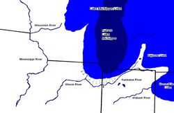 Beginning around 15,000 years ago,[6] the Michigan lobe of the Laurentian glacier had retreated back to a line along the Valparaiso Moraine, from Wisconsin along a line, 30 miles (48 km) inland of Lake Michigan, southward, around the City of Chicago , and the southern tip of Lake Michigan, through Indiana, curving northward into the State of Michigan, only 15 miles (24 km) inland from the shoreline. Meanwhile, the Huron-Saginaw lobe had melted back to the north and east along a line in Michigan extending from Holland eastward through Kalamazoo to Jackson. Beginning 14,000 years ago, the glacial lobes had cleared the valley of the Kankakee River of ice. At this point, the forward movement of ice coming from the north equaled the rate of melting over the summer season. Now stagnant, glacier provided a continuing source of ground rock and soil to the southern edge of the glacier, creating the Valaparaiso Moraine and releasing vast quantities of water, sand and silt into the valley beyond.[6] The water created Lake Kankakee, flooding are area from Momence, Illinois upstream to the east to South Bend, Indiana with a southern pool reaching from Watseka, Illinois east to Monticello and Winamac, Indiana.[7]