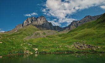 Geologically, the Caucasus Mountains belong to the Alpide belt system that extends from southeastern Europe into Asia[3] and is considered a border between the two continents.[4] The Greater Caucasus Mountains are mainly composed of Cretaceous and Jurassic rocks with the Paleozoic and Precambrian rocks in the higher regions. Some volcanic formations are found throughout the range. On the other hand, the Lesser Caucasus Mountains are formed predominantly of the Paleogene rocks with a much smaller portion of the Jurassic and Cretaceous rocks. The evolution of the Caucasus began from the Late Triassic to the Late Jurassic during the Cimmerian orogeny at the active margin of the Tethys Ocean while the uplift of the Greater Caucasus is dated to the Miocene during the Alpine orogeny.