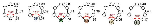 Bond lengths and angles of benzene, pyridine, phosphorine, arsabenzene, stibabenzene and bismabenzene |