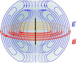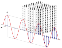 left|200px|Animation of linearly polarized electromagnetic wave, illustrating the directional relationship of the E electric and B magnetic vectors relative to the direction of wave propagation.